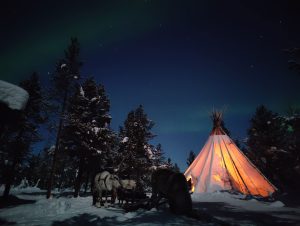 Revontuliretki porojen kanssa alkaa noin 40 minuutin kestoisella poroajelulla tunnelmallisessa pimeässä metsässä. Kirkkaalla kelillä kattonamme toimii loputon tähtitaivas ja pienellä onnella revontulet valaisevat taivaltamme.*